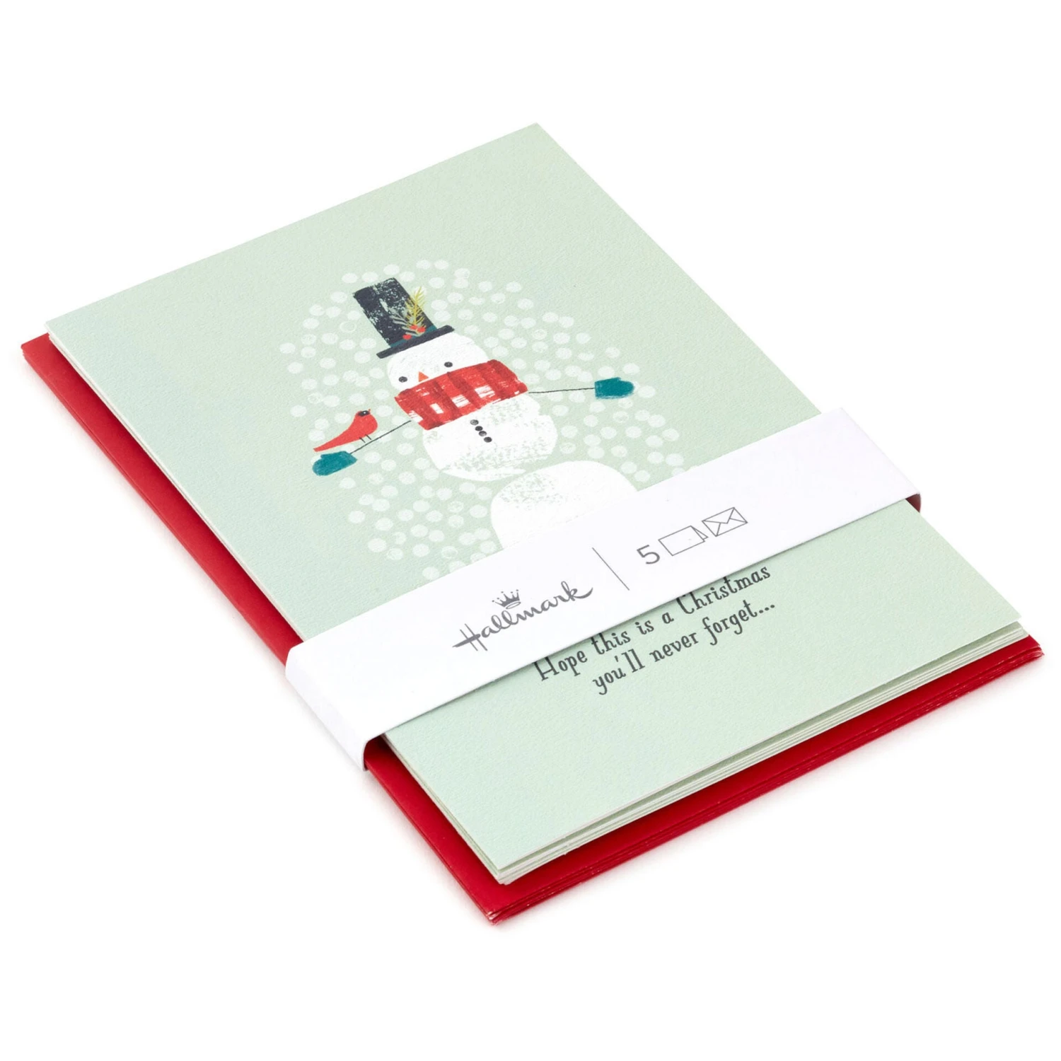 Christmas card pack features an illustrated snowman with cardinal perched on its arm against a light green, slightly textured background. Our convenient pick-a-pack sets of five Christmas cards make it easy to mix, match and share happy holiday wishes with all your family and friends.