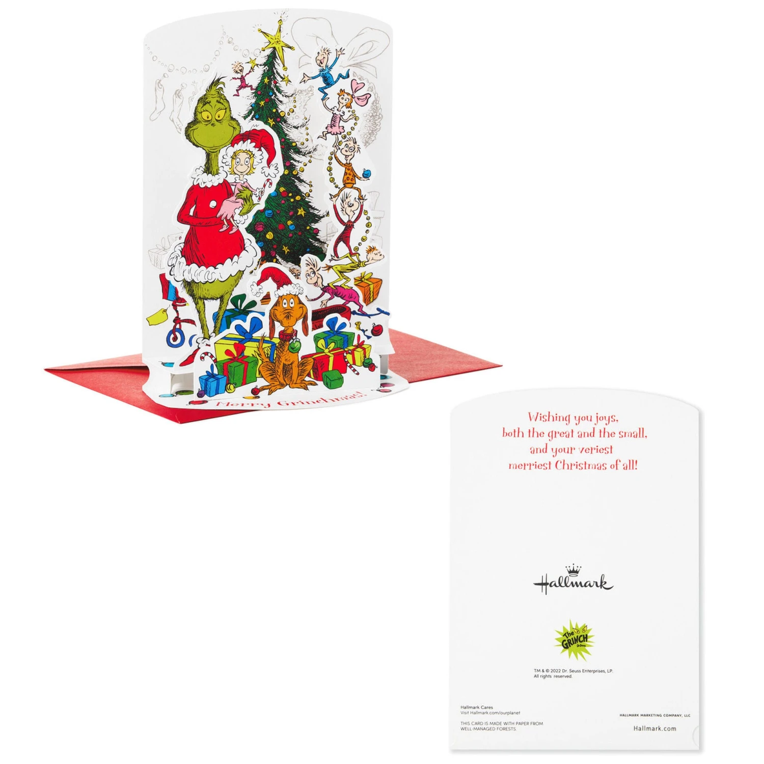 Boxed pop-up Christmas cards feature a laser-cut design of the Grinch holding Cindy-Lou Who in a three-dimensional Christmas tree scene. Simply open the card to reveal the pop-up surprise inside—no assembly required. This multipack of “How the Grinch Stole Christmas” holiday cards is perfect for sending merry Christmas wishes to friends, family and loved ones.