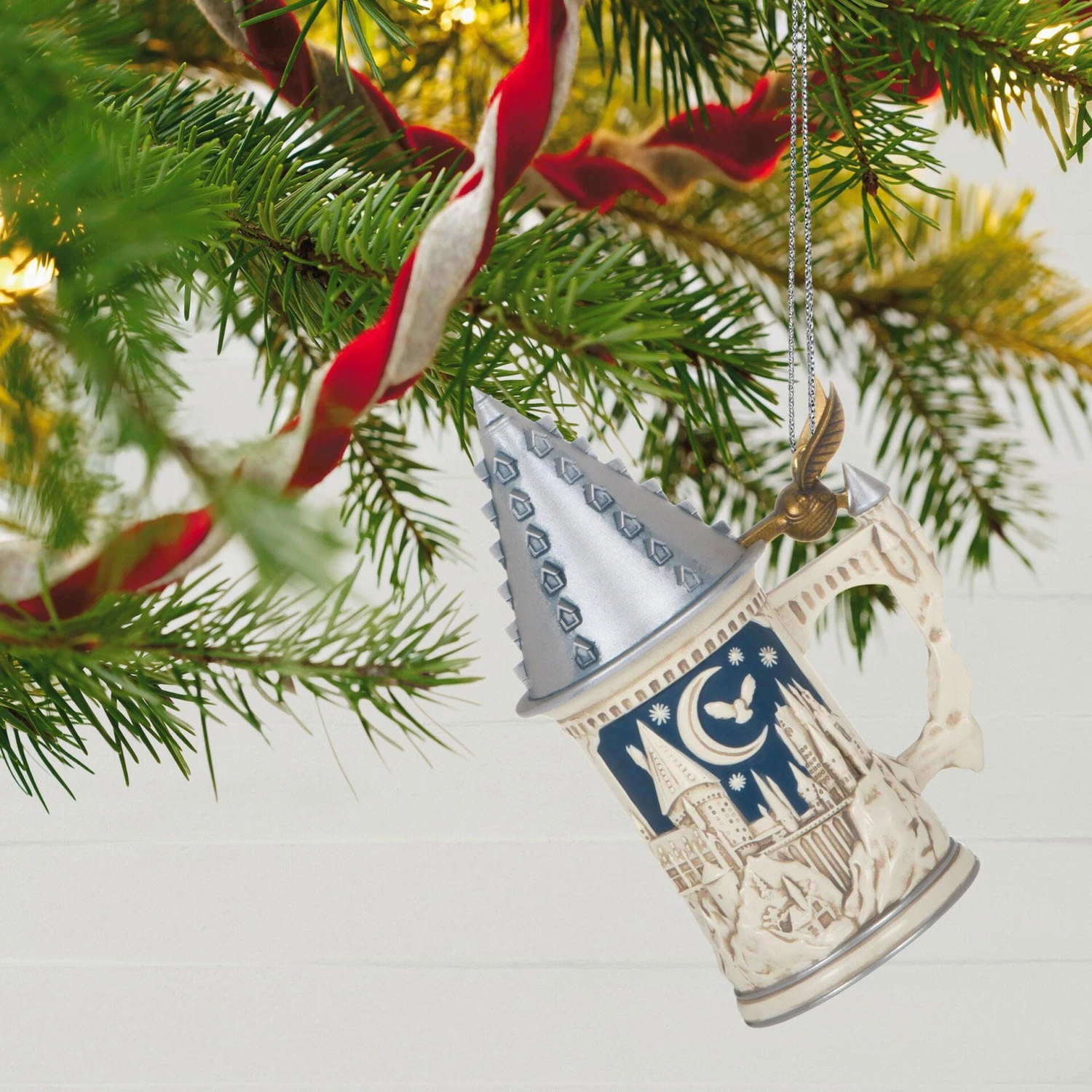 Raise a glass and proudly proclaim your mischievous tendencies with this Christmas tree ornament resembling a vintage mug with a Harry Potter theme. Featuring an intricate, embossed design of Hogwarts School of Witchcraft and Wizardry and the iconic quote that activated the Marauder’s Map, the drink vessel decoration boasts a functional opening lid courtesy of a Golden Snitch hinge.