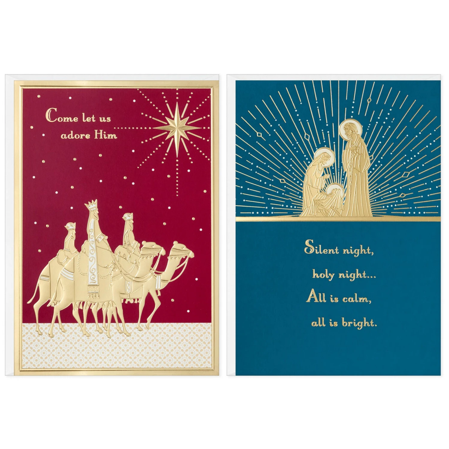 Boxed Christmas cards feature two Christian designs on bold backgrounds: Mary and Joseph at the manger and three wise men on camels. Bulk pack is perfect for sharing faith-filled Christmas blessings to everyone on your list.